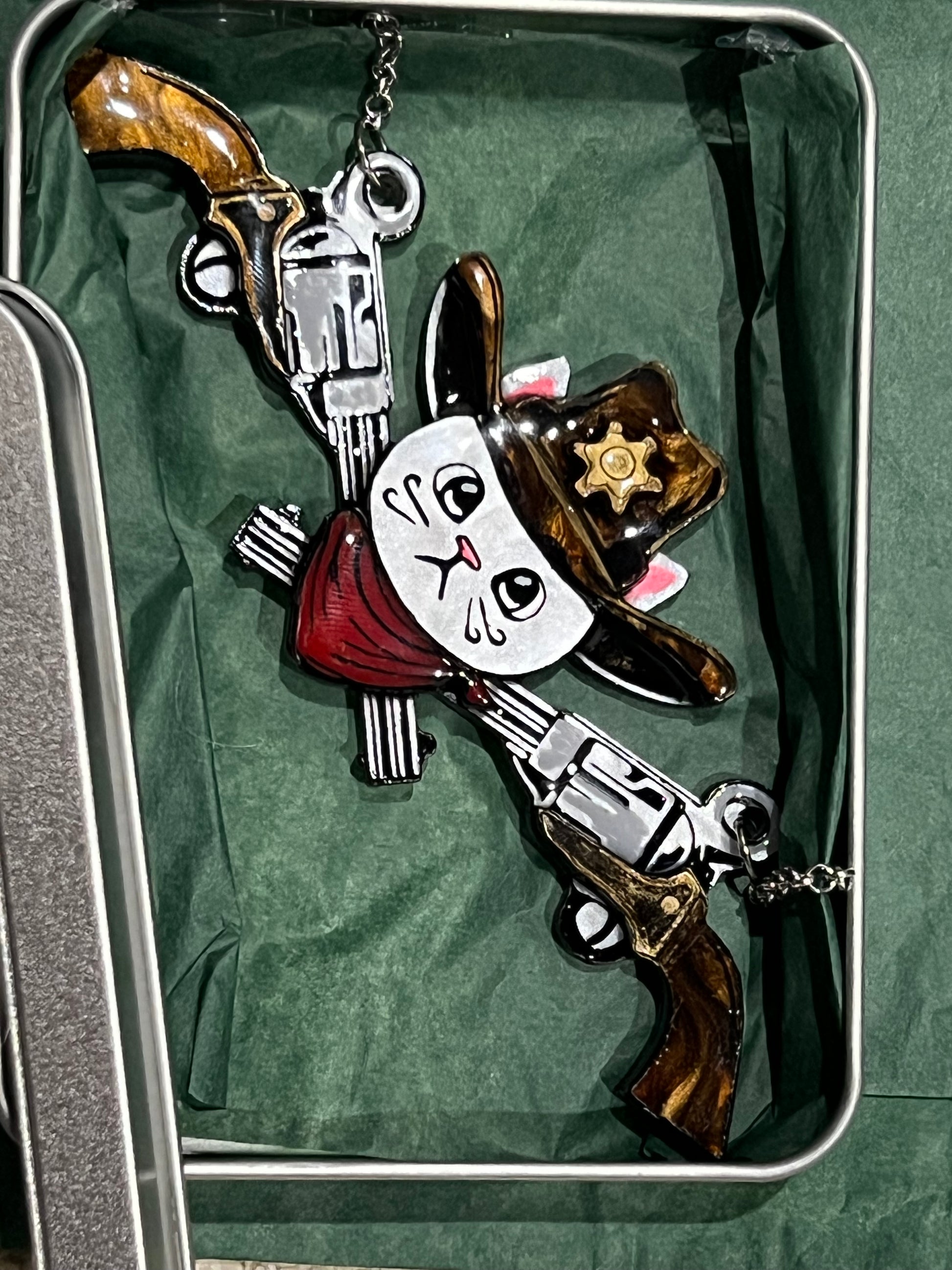 white ripple Tom and pistol barrels,  with chocolate ripple cowboy hat and grips. Plain deep red bandanna. Etched and hand painted details, with bubble resin top coat, for shine and durability.